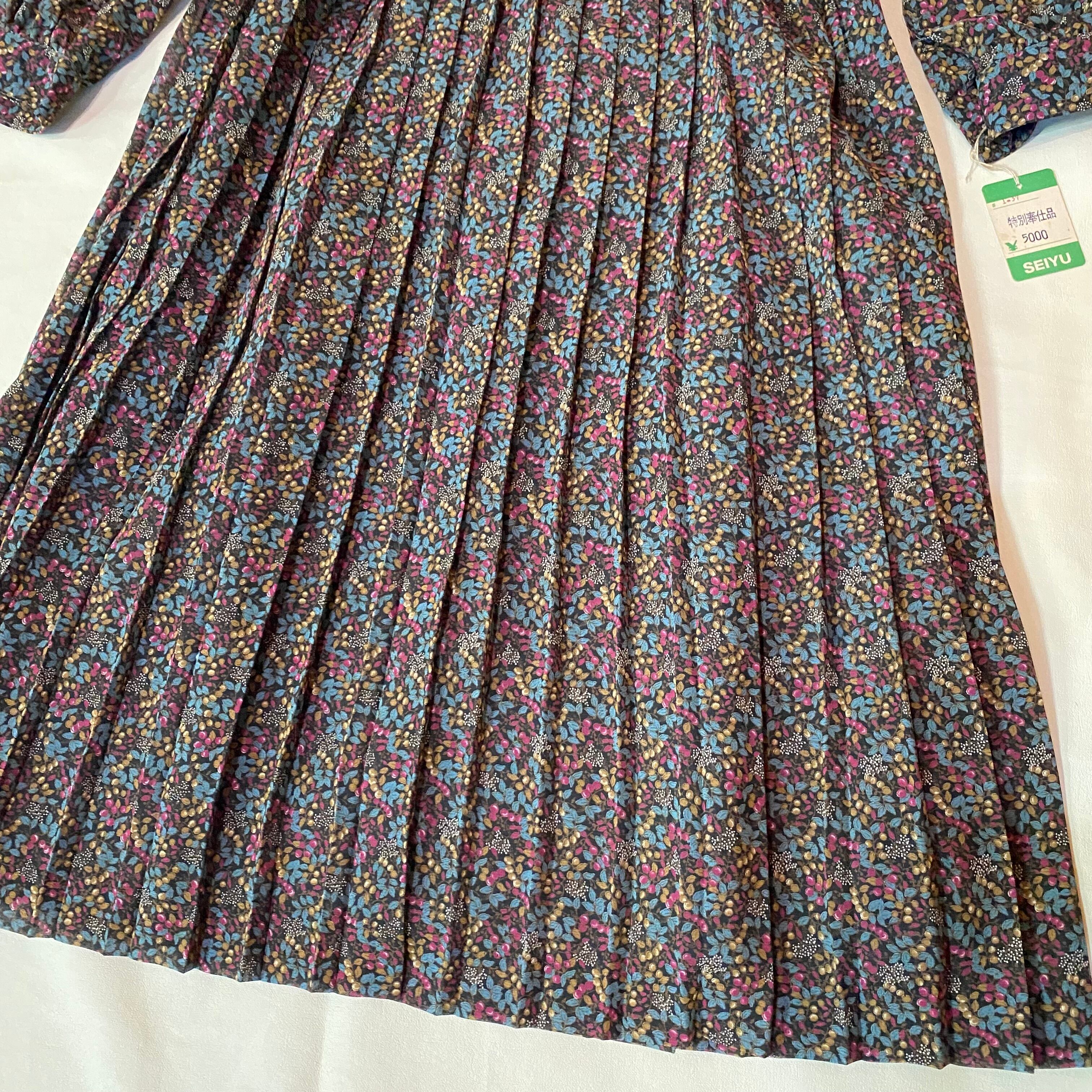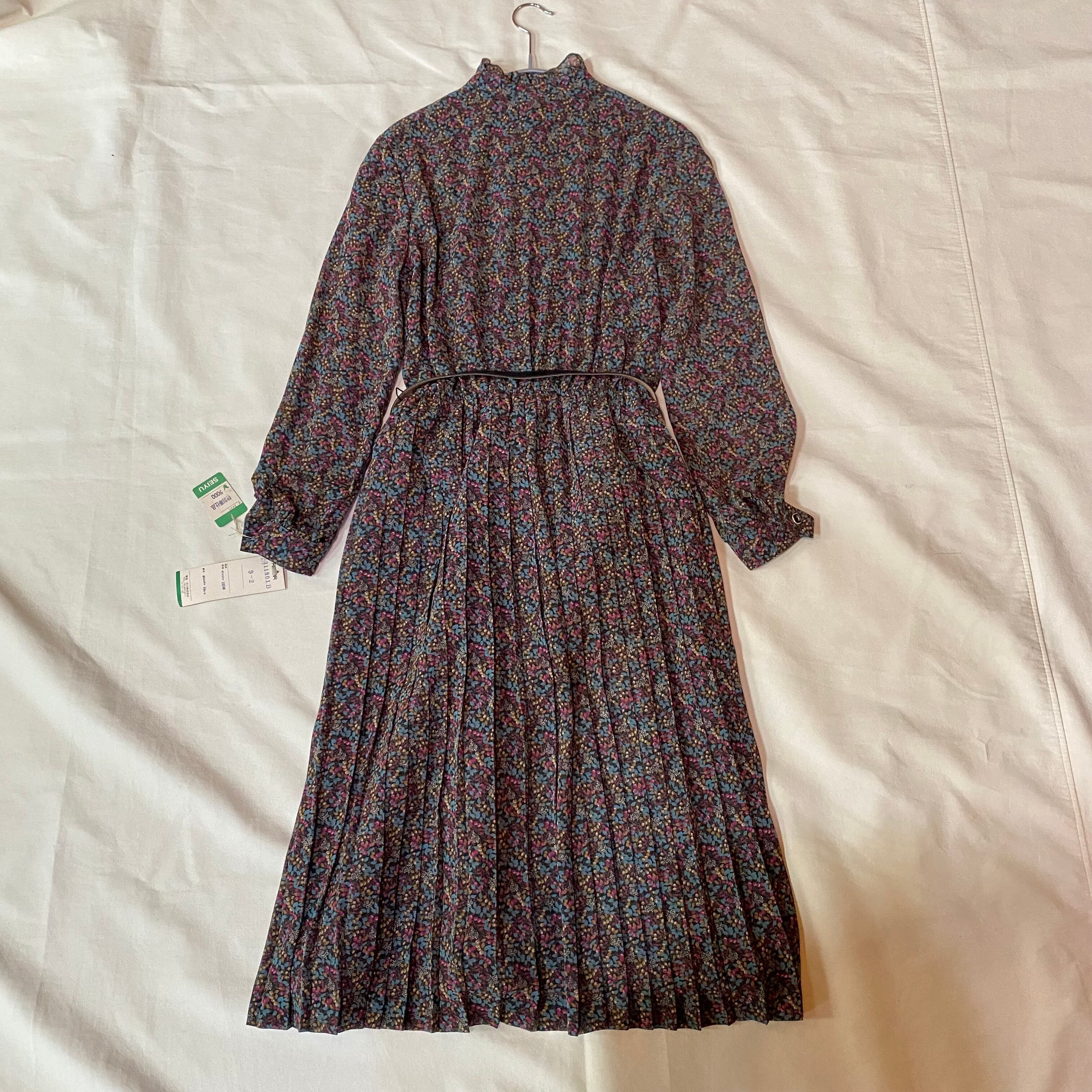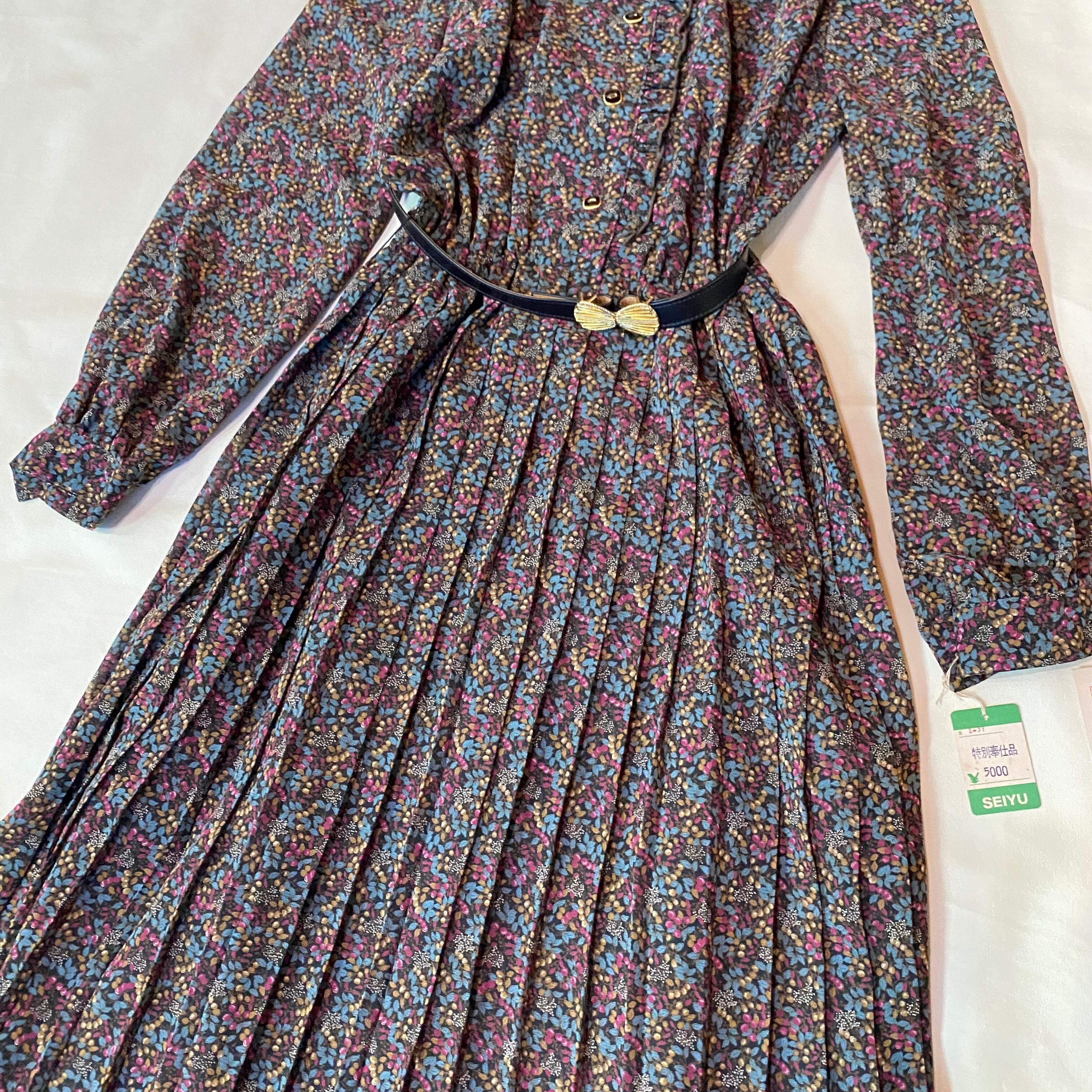 昭和レトロ ボタニカル柄 フリルプリーツロングワンピース ベルト付き 古着 レディース サイズ9