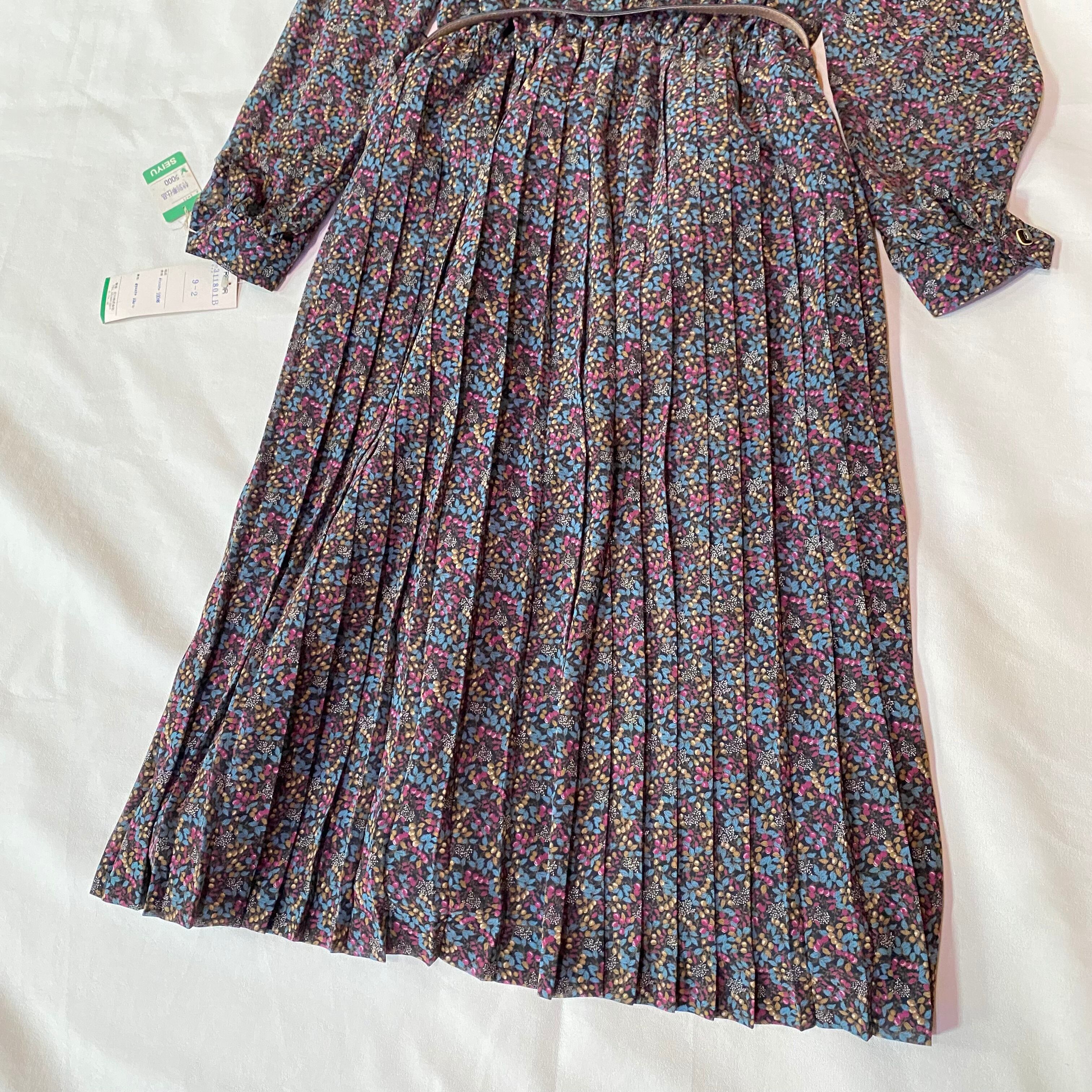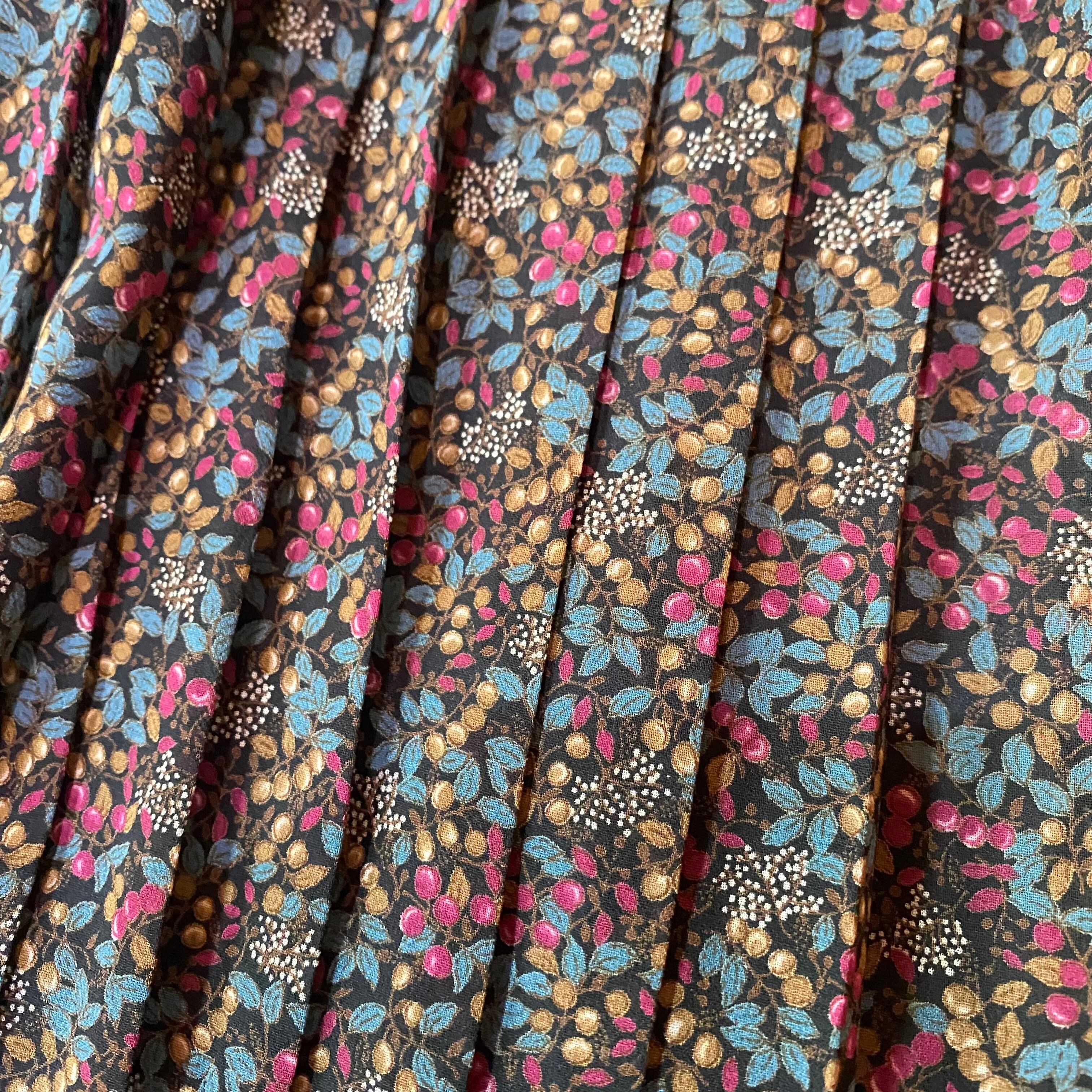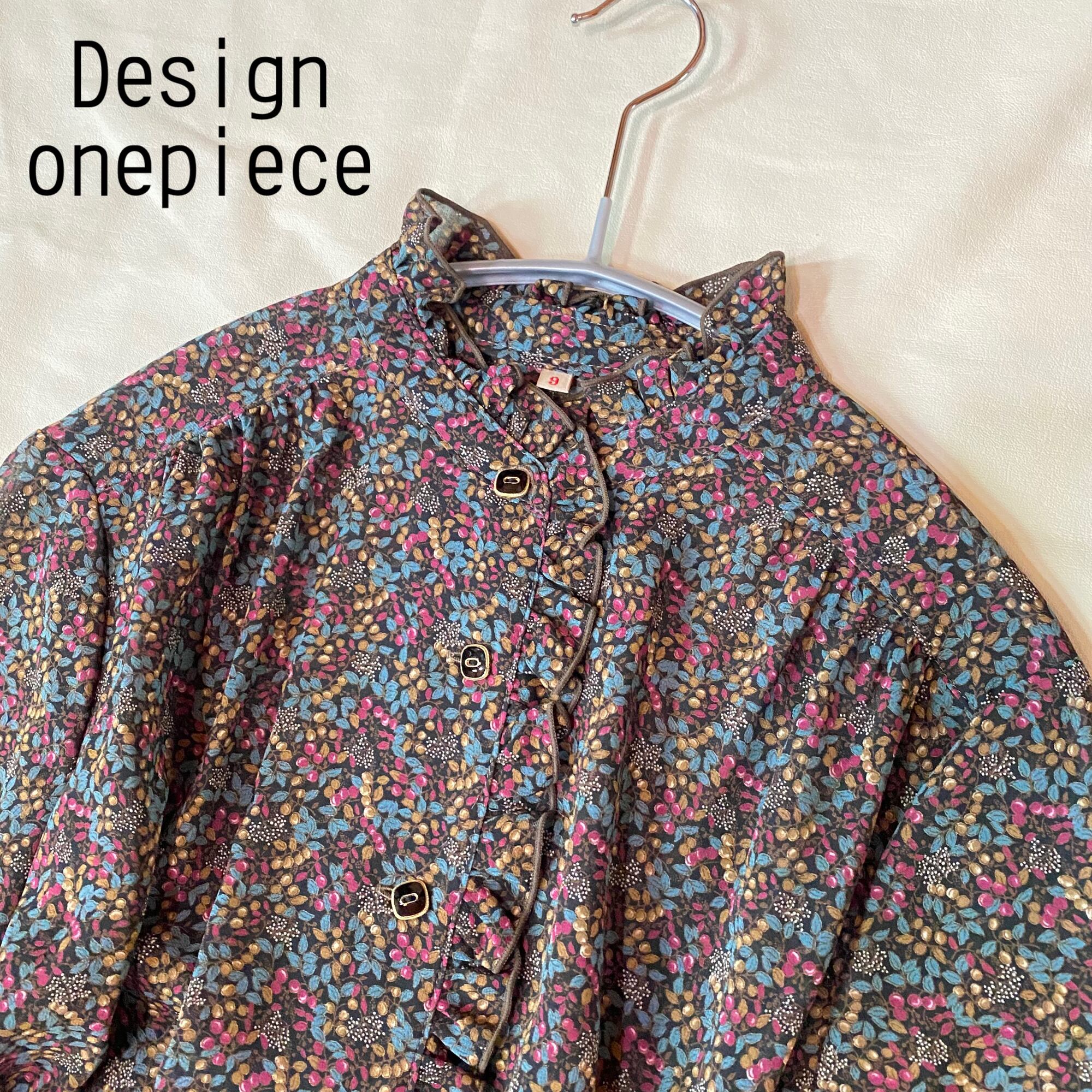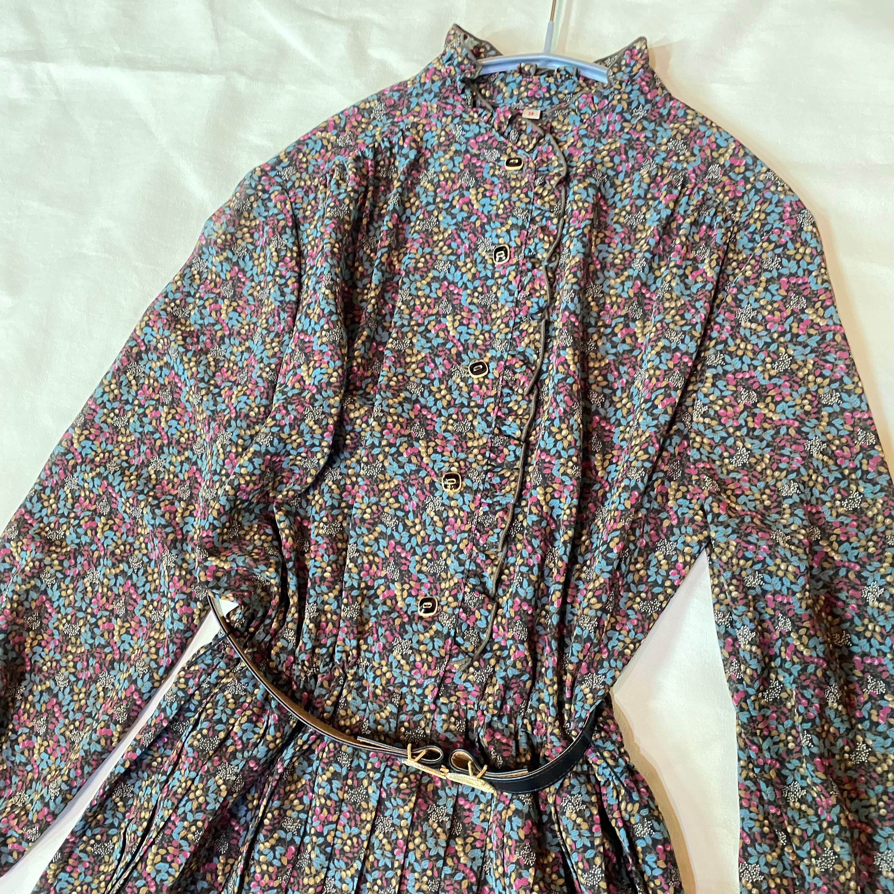 昭和レトロ ボタニカル柄 フリルプリーツロングワンピース ベルト付き 古着 レディース サイズ9