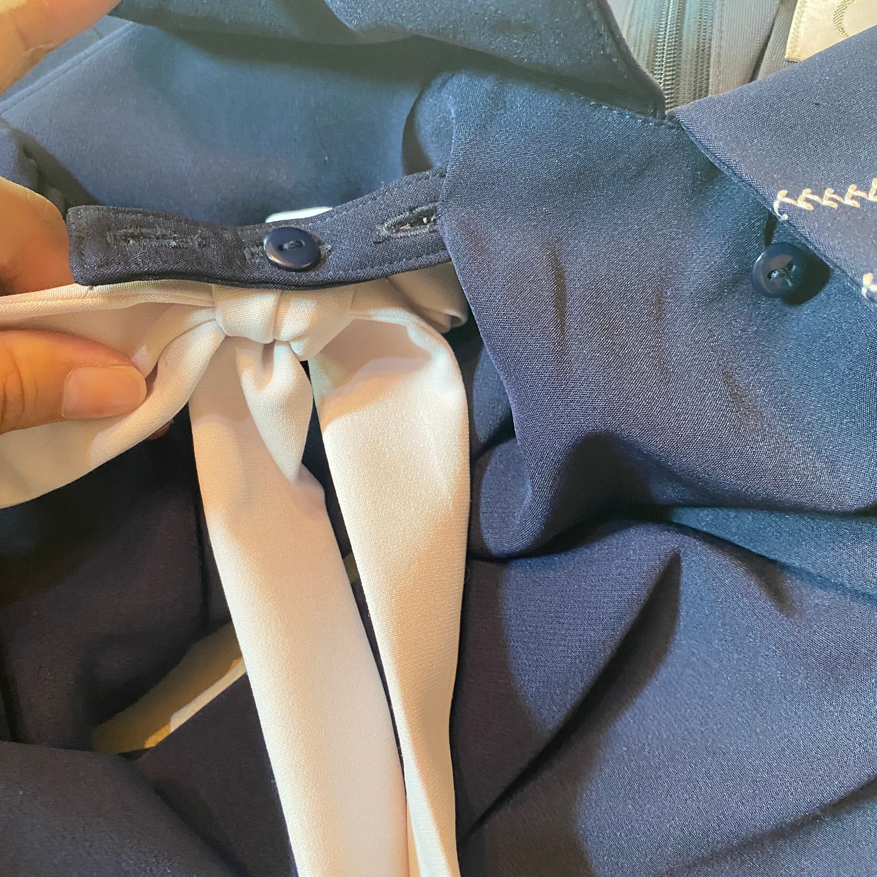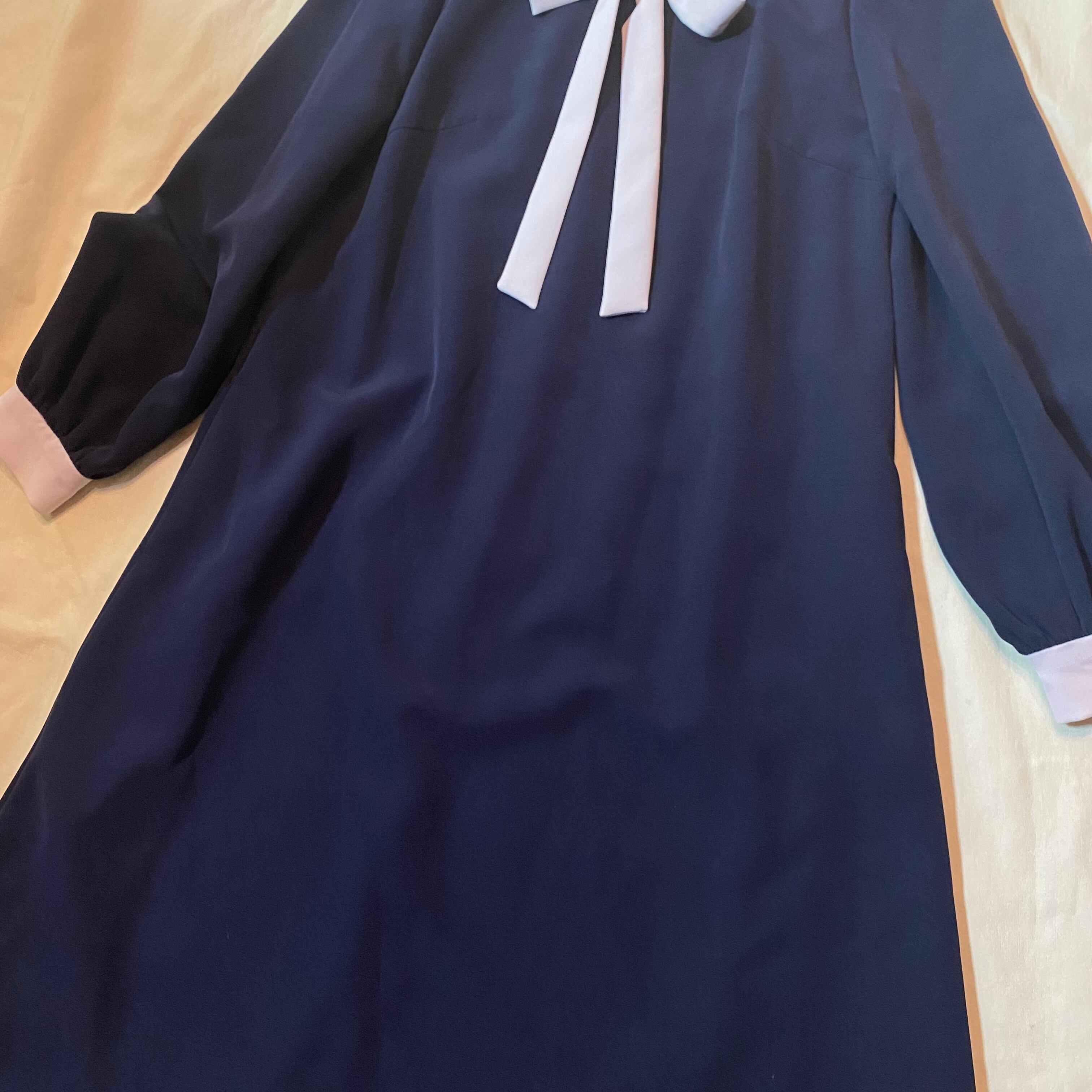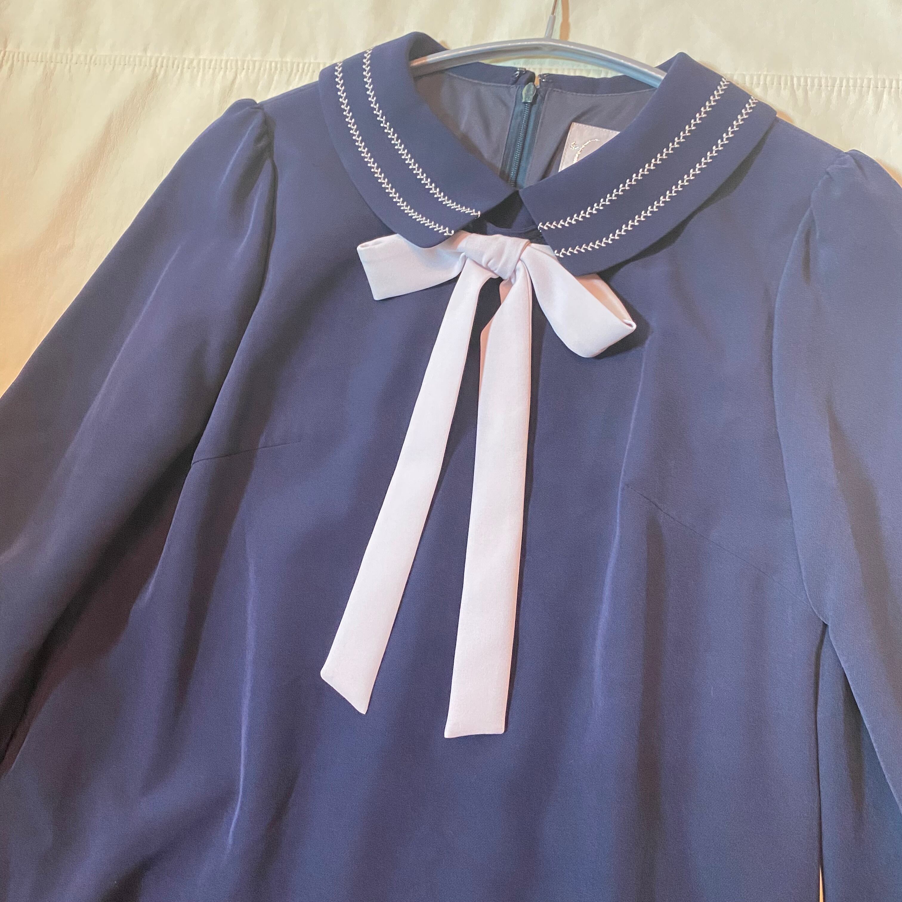 ネイビーにボウタイリボンがシックでかわいいワンピース。